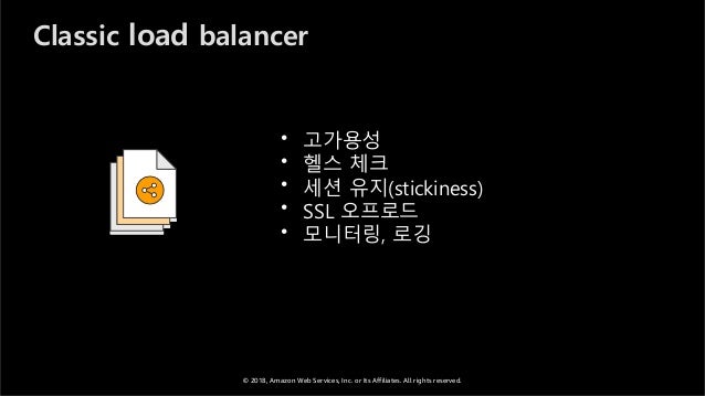 29. 29. © 2018, Amazon Web Services, Inc. or Its Affiliates. All rights reserved. Classic load balancer • 고가용성 • 헬스 체크 • 세션 유지(stickiness) • SSL 오프로드 • 모니터링, 로깅