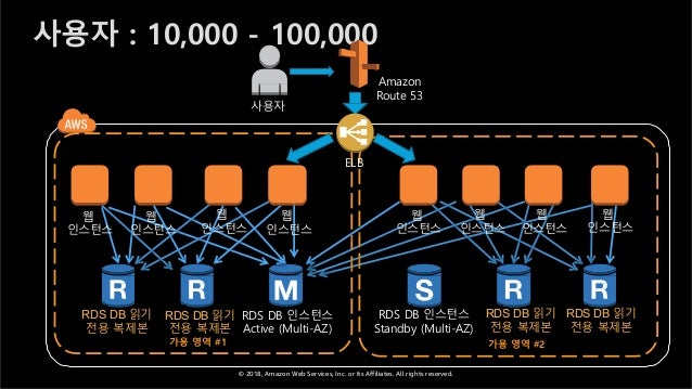 33. 33. © 2018, Amazon Web Services, Inc. or Its Affiliates. All rights reserved. 사용자 : 10,000 - 100,000 ELB 사용자 Amazon Route 53 RDS DB 읽기 전용 복제본 가용 영역 #1 가용 영역 #2 웹 인스턴스 웹 인스턴스 웹 인스턴스 웹 인스턴스 웹 인스턴스 웹 인스턴스 웹 인스턴스 웹 인스턴스 RDS DB 인스턴스 Active (Multi-AZ) RDS DB 인스턴스 Standby (Multi-AZ) RDS DB 읽기 전용 복제본 RDS DB 읽기 전용 복제본 RDS DB 읽기 전용 복제본