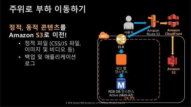 35. 35. © 2018, Amazon Web Services, Inc. or Its Affiliates. All rights reserved. EC2 웹 인스턴스 RDS DB 인스턴스 Active (Multi-AZ) 가용 영역 ELB 정적, 동적 콘텐츠를 Amazon S3로 이전! • 정적 파일 (CSS/JS 파일, 이미지 및 비디오 등) • 백업 및 애플리케이션 로그 사용자 Amazon Route 53 Amazon CloudFront Amazon S3 주위로 부하 이동하기