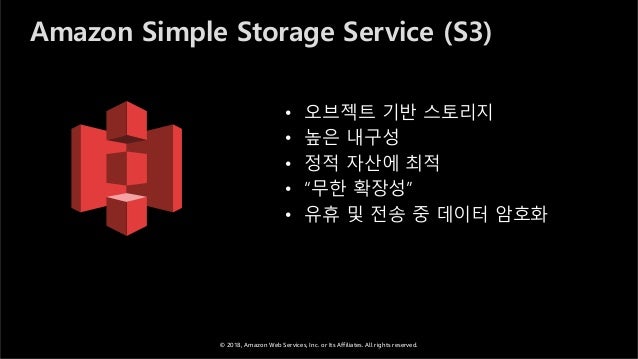 36. 36. © 2018, Amazon Web Services, Inc. or Its Affiliates. All rights reserved. Amazon Simple Storage Service (S3) • 오브젝트 기반 스토리지 • 높은 내구성 • 정적 자산에 최적 • “무한 확장성” • 유휴 및 전송 중 데이터 암호화