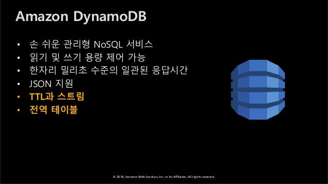 39. 39. © 2018, Amazon Web Services, Inc. or Its Affiliates. All rights reserved. Amazon DynamoDB • 손 쉬운 관리형 NoSQL 서비스 • 읽기 및 쓰기 용량 제어 가능 • 한자리 밀리초 수준의 일관된 응답시간 • JSON 지원 • TTL과 스트림 • 전역 테이블