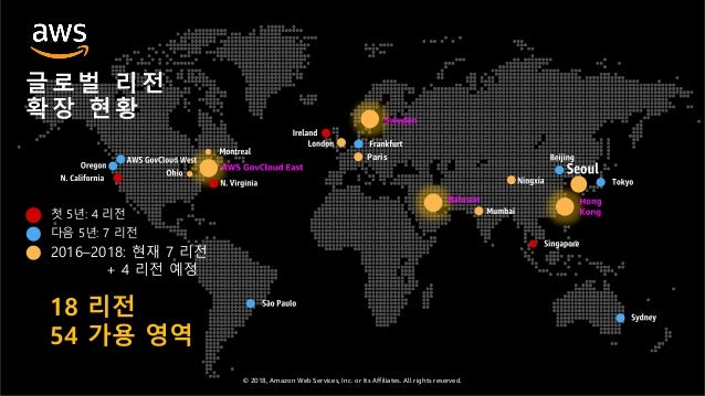 4. 4. © 2018, Amazon Web Services, Inc. or Its Affiliates. All rights reserved. a e o q t i h p Paris u l f d m c b n s k vg i i 첫 5년: 4 리전 다음 5년: 7 리전 글로벌 리전 확장 현황 18 리전 54 가용 영역 2016–2018: 현재 7 리전 + 4 리전 예정