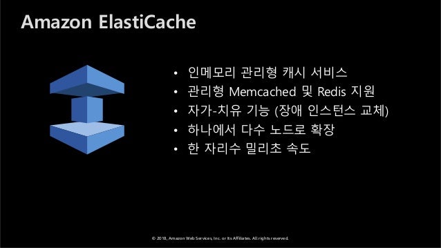 40. 40. © 2018, Amazon Web Services, Inc. or Its Affiliates. All rights reserved. Amazon ElastiCache • 인메모리 관리형 캐시 서비스 • 관리형 Memcached 및 Redis 지원 • 자가-치유 기능 (장애 인스턴스 교체) • 하나에서 다수 노드로 확장 • 한 자리수 밀리초 속도