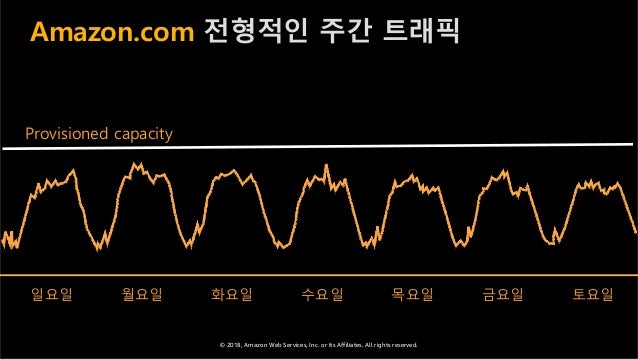 43. 43. © 2018, Amazon Web Services, Inc. or Its Affiliates. All rights reserved. Provisioned capacity 일요일 월요일 화요일 수요일 목요일 금요일 토요일 Amazon.com 전형적인 주간 트래픽