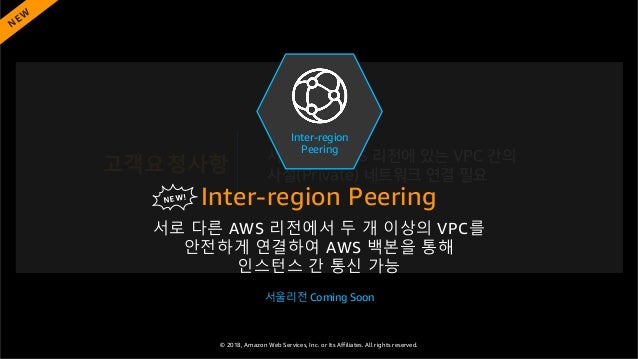 5. 5. © 2018, Amazon Web Services, Inc. or Its Affiliates. All rights reserved. ( ) A C고객요청사항 Inter-region Peering 서로 다른 AWS 리전에서 두 개 이상의 VPC를 안전하게 연결하여 AWS 백본을 통해 인스턴스 간 통신 가능 NEW! Inter-region Peering 서울리전 Coming Soon N EW