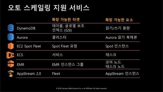 50. 50. © 2018, Amazon Web Services, Inc. or Its Affiliates. All rights reserved. 오토 스케일링 지원 서비스 클러스터 Fleet Aurora 읽기 복제본 EMR 인스턴스 그룹 확장 가능한 타겟 확장 가능한 요소 Aurora 서비스 태스크ECS Spot Fleet 요청 Spot 인스턴스EC2 Spot Fleet AppStream 2.0 EMR 코어 노드 태스크 노드 AppStream 인스턴스 테이블, 글로벌 보조 인덱스 (GSI) 읽기/쓰기 용량DynamoDB