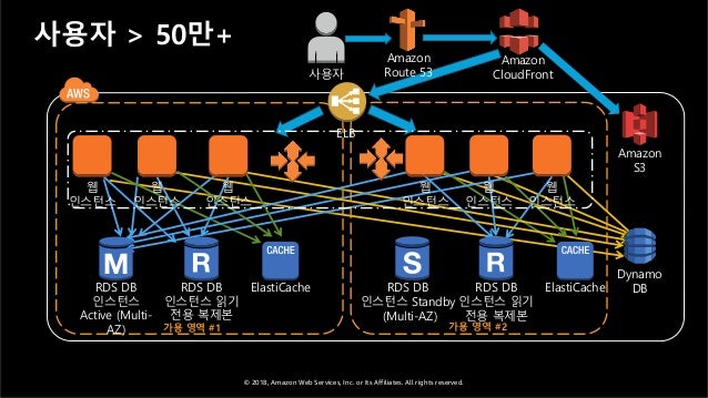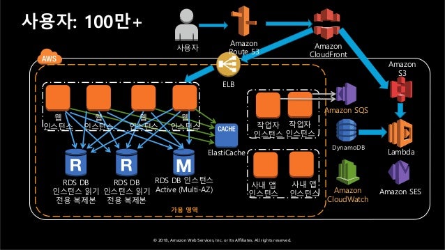 67. 67. © 2018, Amazon Web Services, Inc. or Its Affiliates. All rights reserved. 사용자: 100만+ RDS DB 인스턴스 Active (Multi-AZ) 가용 영역 ELB RDS DB 인스턴스 읽기 전용 복제본 RDS DB 인스턴스 읽기 전용 복제본 웹 인스턴스 웹 인스턴스 웹 인스턴스 웹 인스턴스 DynamoDB Amazon SQS ElastiCache 작업자 인스턴스 작업자 인스턴스 Amazon CloudWatch 사내 앱 인스턴스 사내 앱 인스턴스 사용자 Amazon Route 53 Amazon CloudFront Amazon S3 Amazon SES Lambda