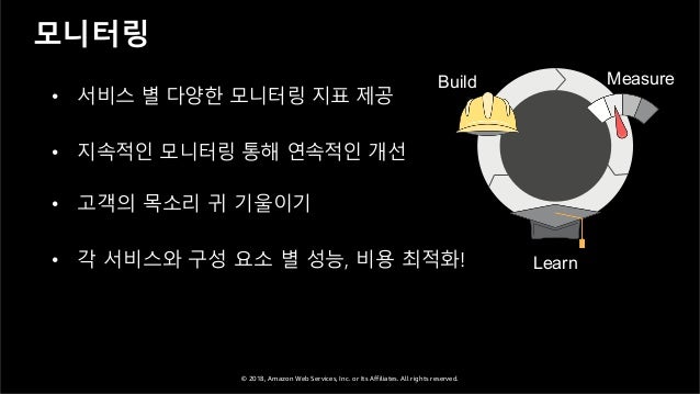 55. 55. © 2018, Amazon Web Services, Inc. or Its Affiliates. All rights reserved. 모니터링 Build Measure Learn • 서비스 별 다양한 모니터링 지표 제공 • 지속적인 모니터링 통해 연속적인 개선 • 고객의 목소리 귀 기울이기 • 각 서비스와 구성 요소 별 성능, 비용 최적화!