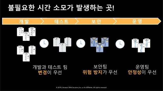 58. 58. © 2018, Amazon Web Services, Inc. or Its Affiliates. All rights reserved. 불필요한 시간 소모가 발생하는 곳! 개발과 테스트 팀 변경이 우선 보안팀 위험 방지가 우선 운영팀 안정성이 우선 개발 테스트 보 안 운 영