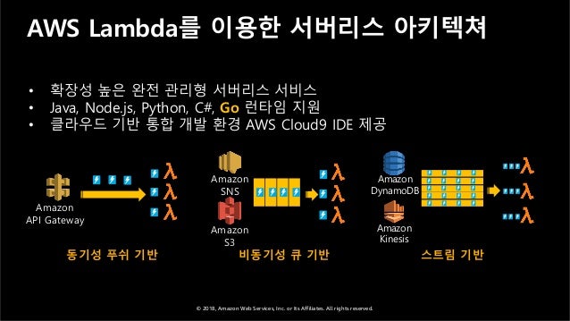 64. 64. © 2018, Amazon Web Services, Inc. or Its Affiliates. All rights reserved. AWS Lambda를 이용한 서버리스 아키텍쳐 • 확장성 높은 완전 관리형 서버리스 서비스 • Java, Node.js, Python, C#, Go 런타임 지원 • 클라우드 기반 통합 개발 환경 AWS Cloud9 IDE 제공 비동기성 큐 기반동기성 푸쉬 기반 스트림 기반 Amazon API Gateway Amazon SNS Amazon S3 Amazon DynamoDB Amazon Kinesis