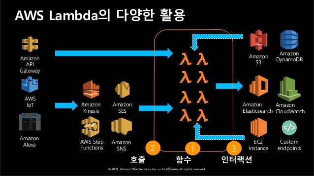 65. 65. © 2018, Amazon Web Services, Inc. or Its Affiliates. All rights reserved. AWS Lambda의 다양한 활용 Amazon API Gateway Amazon Alexa AWS IoT Amazon Kinesis Amazon SNS Amazon SES AWS Step Functions 2 호출 1 함수 3 인터랙션 Amazon S3 Amazon DynamoDB Custom endpoints Amazon CloudWatch Amazon Elasticsearch EC2 instance