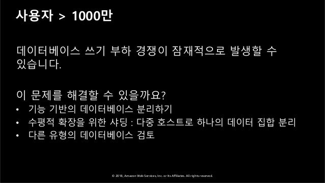 69. 69. © 2018, Amazon Web Services, Inc. or Its Affiliates. All rights reserved. 사용자 > 1000만 데이터베이스 쓰기 부하 경쟁이 잠재적으로 발생할 수 있습니다. 이 문제를 해결할 수 있을까요? • 기능 기반의 데이터베이스 분리하기 • 수평적 확장을 위한 샤딩 : 다중 호스트로 하나의 데이터 집합 분리 • 다른 유형의 데이터베이스 검토