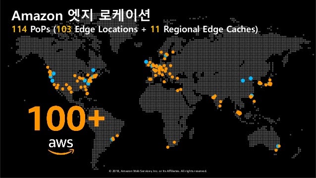 7. 7. © 2018, Amazon Web Services, Inc. or Its Affiliates. All rights reserved. ss Amazon 엣지 로케이션 114 PoPs (103 Edge Locations + 11 Regional Edge Caches)