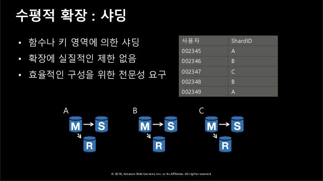 71. 71. © 2018, Amazon Web Services, Inc. or Its Affiliates. All rights reserved. 수평적 확장 : 샤딩 CBA 사용자 ShardID 002345 A 002346 B 002347 C 002348 B 002349 A • 함수나 키 영역에 의한 샤딩 • 확장에 실질적인 제한 없음 • 효율적인 구성을 위한 전문성 요구