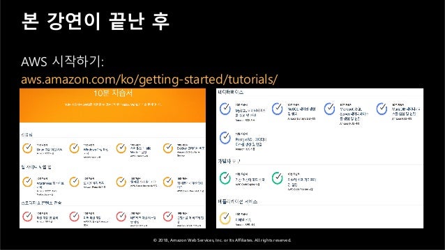 76. 76. © 2018, Amazon Web Services, Inc. or Its Affiliates. All rights reserved. 본 강연이 끝난 후 AWS 시작하기: aws.amazon.com/ko/getting-started/tutorials/