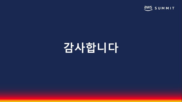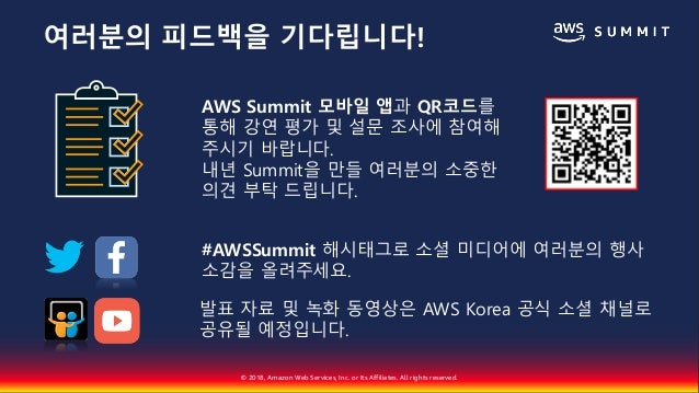 78. 78. © 2018, Amazon Web Services, Inc. or Its Affiliates. All rights reserved. AWS Summit 모바일 앱과 QR코드를 통해 강연 평가 및 설문 조사에 참여해 주시기 바랍니다. 내년 Summit을 만들 여러분의 소중한 의견 부탁 드립니다. #AWSSummit 해시태그로 소셜 미디어에 여러분의 행사 소감을 올려주세요. 발표 자료 및 녹화 동영상은 AWS Korea 공식 소셜 채널로 공유될 예정입니다. 여러분의 피드백을 기다립니다!