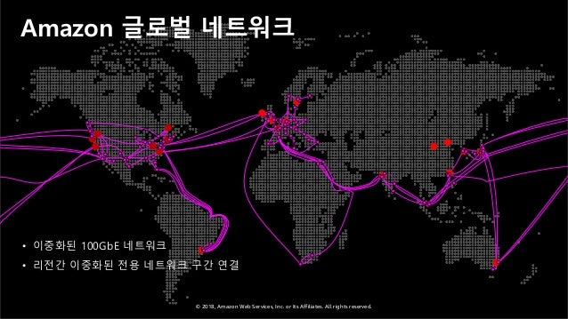 8. 8. © 2018, Amazon Web Services, Inc. or Its Affiliates. All rights reserved. Amazon 글로벌 네트워크 • 이중화된 100GbE 네트워크 • 리전간 이중화된 전용 네트워크 구간 연결
