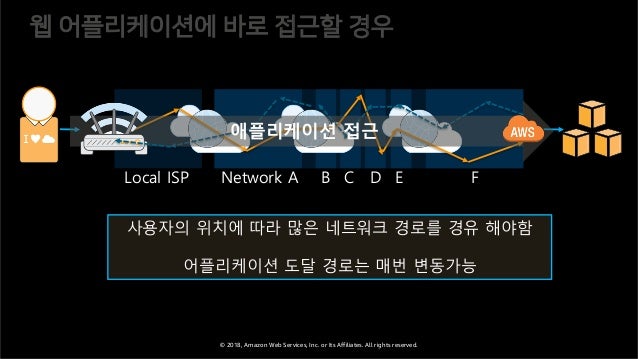 9. 9. © 2018, Amazon Web Services, Inc. or Its Affiliates. All rights reserved. 사용자의 위치에 따라 많은 네트워크 경로를 경유 해야함 어플리케이션 도달 경로는 매번 변동가능 Local ISP Network A B C D E F 애플리케이션 접근