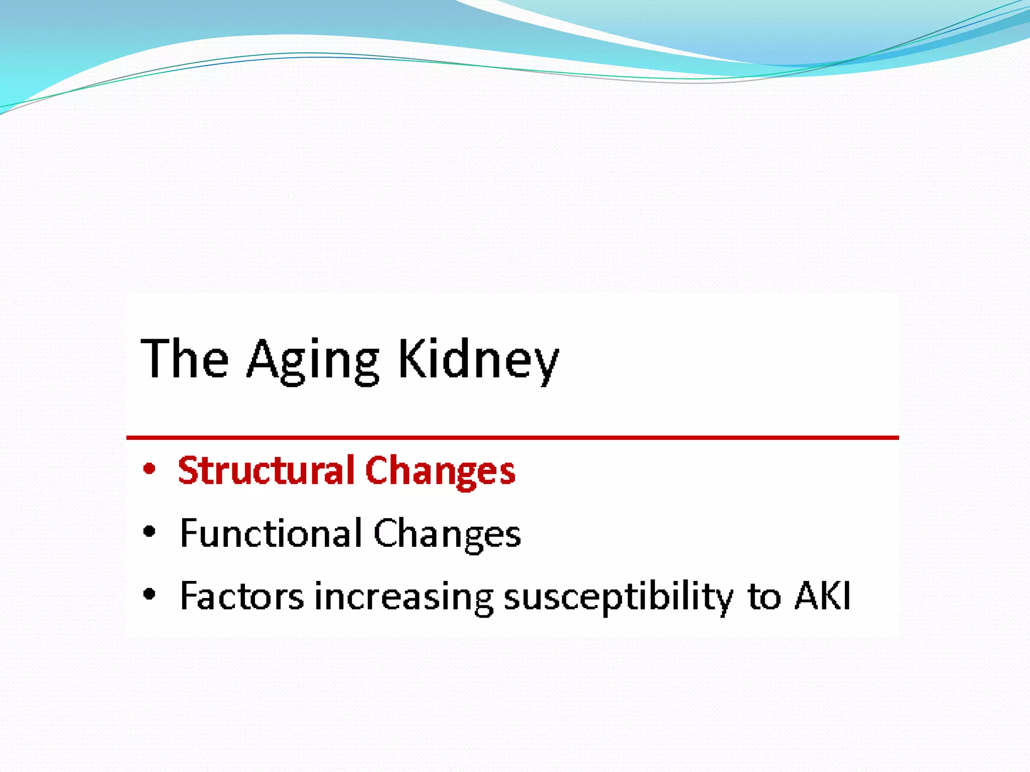 The document discusses how aging impacts the kidneys. As people age, their kidneys undergo structural and functional changes such as loss of mass and function, granularity on the external surface, and thickening of arteries. The prevalence of conditions like diabetes, hypertension, and high cholesterol increase with age and contribute to declining kidney function. Studies show that while chronic kidney disease risk increases with age, elderly patients are less likely than younger patients to progress to end-stage renal disease, though a subset will eventually need renal replacement therapy. Nephrologists face the challenge of identifying older patients with declining kidney function who would benefit from interventions to slow progression.