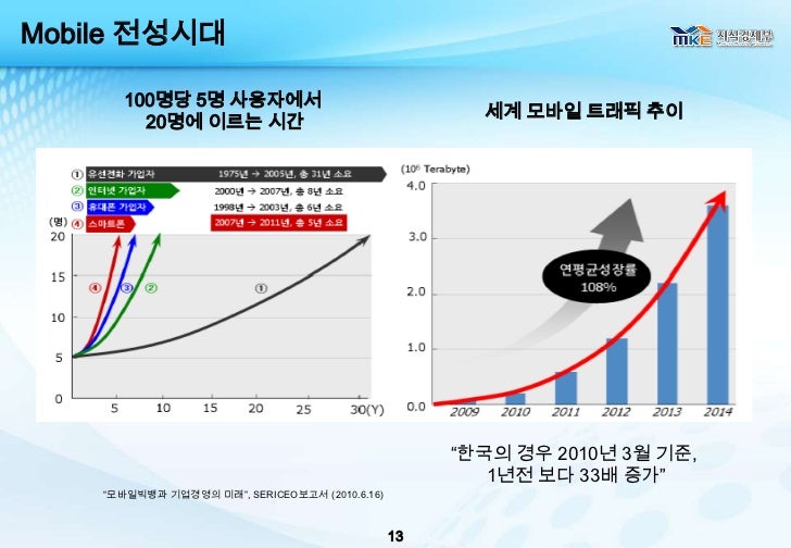 13. 13. Mobile 전성시대<br />100명당 5명 사용자에서 <br />20명에 이르는 시간<br />세계 모바일트래픽 추이<br />“한국의 경우 2010년 3월 기준,<br /> 1년전 보다 33배 증가”<br />“모바일빅뱅과 기업경영의 미래”, SERICEO보고서 (2010.6.16)<br />