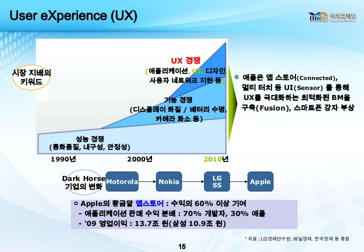 15. 15. User eXperience (UX)<br />UX 경쟁<br />시장 지배의키워드<br />(애플리케이션, UI, 디자인,<br /> 사용자 네트워크 지원 등)<br />애플은 앱 스토어(Connected),<br />멀티 터치 등UI(Sensor) 를 통해<br /> UX를 극대화하는 최적화된 BM을<br /> 구축(Fusion), 스마트폰강자 부상<br />기능 경쟁<br />(디스플레이 화질 / 배터리 수명, <br />카메라 화소 등)<br />성능 경쟁(통화품질, 내구성, 안정성)<br />1990년<br />2000년<br />2010년<br />Dark Horse기업의 변화<br />Motorola<br />Nokia<br />LGSS<br />Apple<br />○ Apple의황금알 앱스토어: 수익의 60% 이상 기여<br /> - 애플리케이션 판매 수익 분배 :70% 개발자, 30% 애플 <br /> - ‘09 영업이익 : 13.7조 원(삼성 10.9조 원)<br />* 자료 : LG경제연구원, 매일경제, 한국경제 등 종합<br />