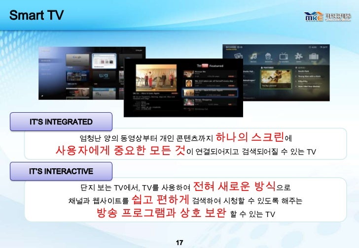 17. 17. Smart TV<br />IT’S INTEGRATED<br />엄청난 양의 동영상부터 개인 콘텐츠까지하나의 스크린에 <br />사용자에게 중요한 모든 것이 연결되어지고 검색되어질 수 있는 TV<br />IT’S INTERACTIVE<br />단지 보는 TV에서, TV를 사용하여 전혀 새로운 방식으로 <br />채널과 웹사이트를 쉽고 편하게 검색하여 시청할 수 있도록 해주는 <br />방송프로그램과 상호 보완 할 수 있는 TV<br />