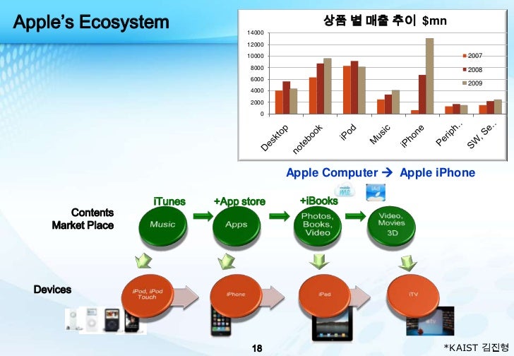 18. 18. 상품 별 매출 추이 $mn<br />Apple Computer  Apple iPhone<br />+iBooks<br />+App store<br />iTunes<br />Contents<br />Market Place<br />Devices<br />Apple’s Ecosystem<br />*KAIST 김진형<br />