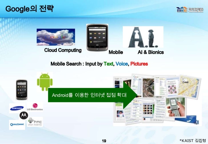 19. 19. Google의전략<br />Mobile Search : Input by Text, Voice, Pictures<br />Cloud Computing<br />Android를 이용한 인터넷 접점 확대<br />Mobile<br />AI & Bionics<br />*KAIST 김진형<br />