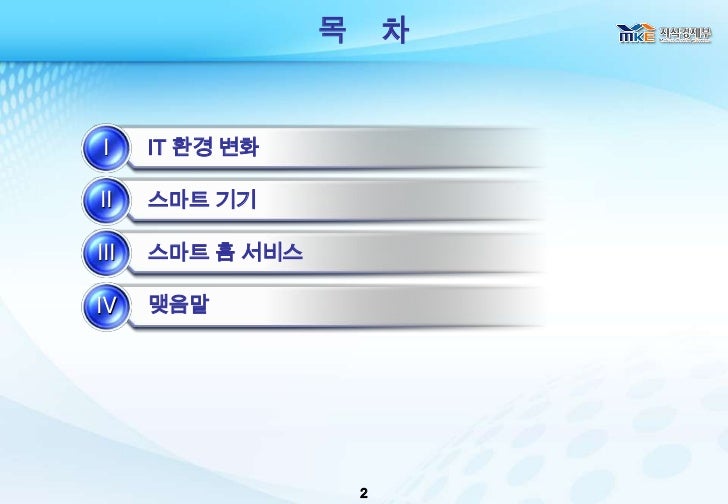 2. 2. 목 차<br />IT 환경 변화<br />I<br />스마트 기기<br />II<br />스마트 홈 서비스<br />III<br />맺음말<br />IV<br />