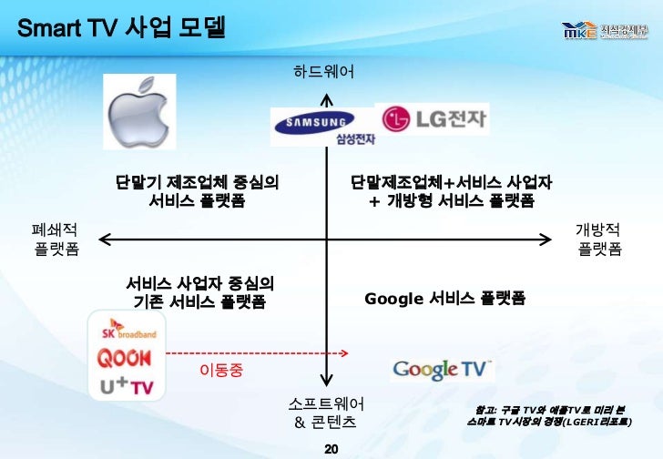 20. 20. Smart TV 사업 모델 <br />하드웨어<br />단말기 제조업체 중심의<br />서비스 플랫폼<br />단말제조업체+서비스 사업자<br />+ 개방형 서비스 플랫폼<br />폐쇄적 <br />플랫폼<br />개방적 <br />플랫폼<br />서비스 사업자 중심의<br />기존 서비스 플랫폼<br />Google 서비스 플랫폼<br />이동중<br />소프트웨어<br />& 콘텐츠<br />참고: 구글TV와 애플TV로 미리 본<br />스마트 TV시장의 경쟁(LGERI리포트)<br />