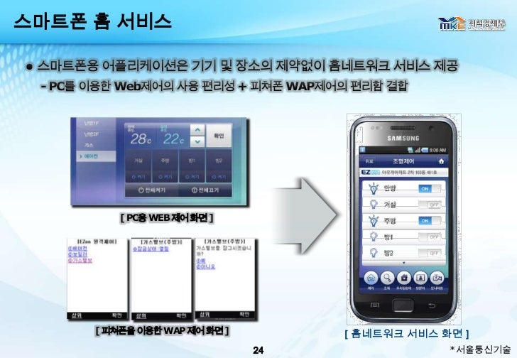 31. 31. 스마트폰 홈 서비스<br /><ul><li>스마트폰용 어플리케이션은 기기 및 장소의 제약없이홈네트워크 서비스 제공</li></ul> - PC를 이용한 Web제어의 사용 편리성 +피쳐폰WAP제어의 편리함 결합<br />[ PC용 WEB 제어 화면 ]<br />[ 피쳐폰을 이용한 WAP 제어 화면 ]<br />[ 홈네트워크 서비스 화면 ]<br />*서울통신기술<br />