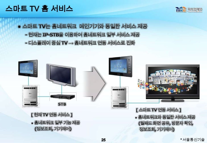 32. 32. 스마트 TV 홈 서비스<br /><ul><li>스마트 TV는 홈네트워크 메인기기와 동일한 서비스 제공</li></ul> - 현재는 IP-STB을 이용하여 홈네트워크 일부 서비스 제공<br /> - 디스플레이 중심 TV -> 홈네트워크 연동 서비스로 진화<br />IP-STB<br />[ 스마트 TV 연동 서비스 ]<br />[ 현재 TV 연동 서비스 ]<br /><ul><li>홈네트워크와 동일한 서비스 제공 </li></ul> (월패드 화면 공유, 방문자 확인, <br />정보조회, 기기제어)<br /><ul><li>홈네트워크 일부 기능 제공 </li></ul> (정보조회, 기기제어)<br />*서울통신기술<br />