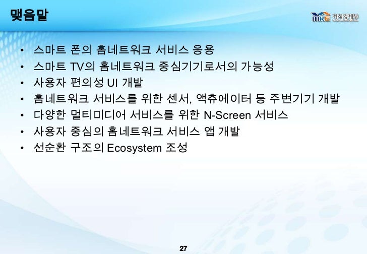 37. 37. 맺음말<br />스마트 폰의홈네트워크 서비스 응용<br />스마트 TV의 홈네트워크 중심기기로서의 가능성<br />사용자편의성 UI 개발<br />홈네트워크 서비스를 위한 센서, 액츄에이터 등 주변기기 개발<br />다양한 멀티미디어 서비스를 위한 N-Screen 서비스<br />사용자 중심의 홈네트워크 서비스 앱 개발<br />선순환 구조의 Ecosystem 조성<br />