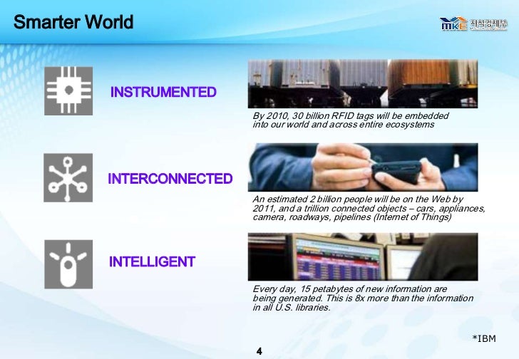 4. 4. Smarter World<br />INSTRUMENTED<br />By 2010, 30 billion RFID tags will be embedded <br />into our world and across entire ecosystems<br />INTERCONNECTED<br />An estimated 2 billion people will be on the Web by <br />2011, and a trillion connected objects – cars, appliances, <br />camera, roadways, pipelines (Internet of Things)<br />INTELLIGENT<br />Every day, 15 petabytes of new information are <br />being generated. This is 8x more than the information <br />in all U.S. libraries.<br />*IBM<br />