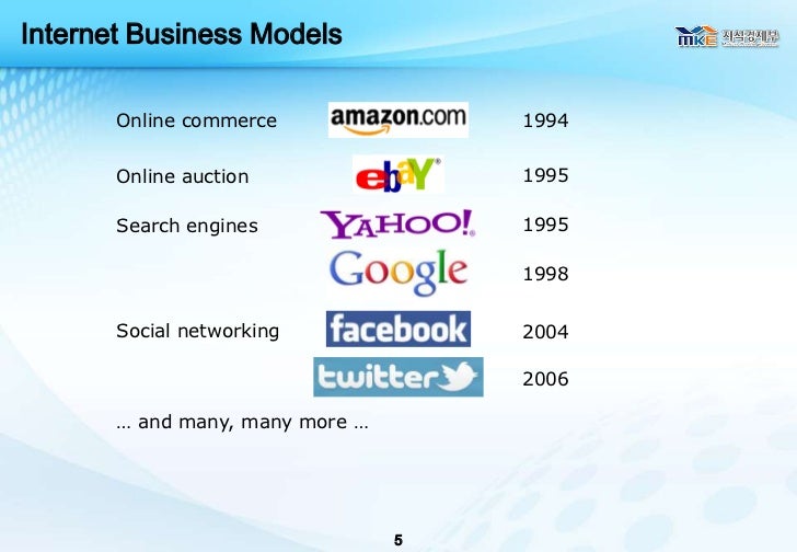 5. 5. Internet Business Models<br />Online commerce<br />1994<br />1995<br />Online auction<br />1995<br />Search engines<br />1998<br />Social networking<br />2004<br />2006<br />… and many, many more …<br />