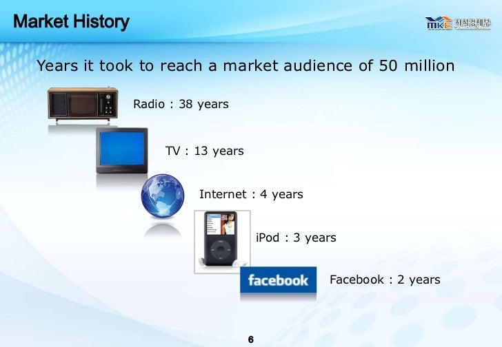 6. 6. Market History<br />Years it took to reach a market audience of 50 million<br />Radio : 38 years<br />TV : 13 years<br />Internet : 4 years<br />iPod : 3 years<br />Facebook : 2 years<br />