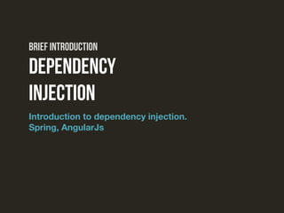 Dependency injection design pattern is introduced in order to solve some common issues due to explicit wiring between a component and its collaborator or service. Spring Framework and AngularJS are involved to show how dependency injection could simplify the way of writing code but above all testing. Clean and concise code is obtained using DI. Real example are provided on Github and Plunkr.
