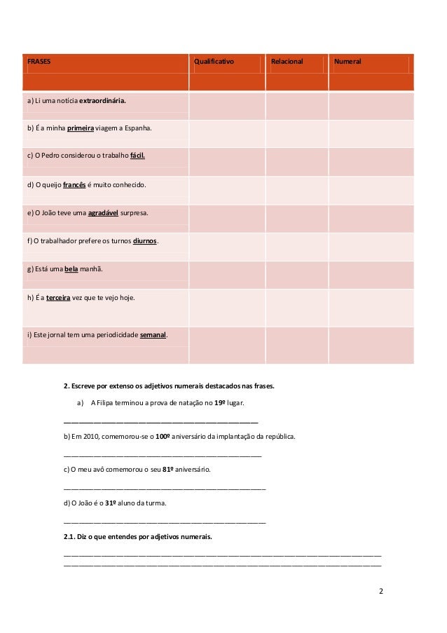 2. 2. 2 FRASES Qualificativo Relacional Numeral a) Li uma notícia extraordinária. b) É a minha primeira viagem a Espanha. c) O Pedro considerou o trabalho fácil. d) O queijo francês é muito conhecido. e) O João teve uma agradável surpresa. f) O trabalhador prefere os turnos diurnos. g) Está uma bela manhã. h) É a terceira vez que te vejo hoje. i) Este jornal tem uma periodicidade semanal. 2. Escreve por extenso os adjetivos numerais destacados nas frases. a) A Filipa terminou a prova de natação no 19º lugar. ____________________________________________________ b) Em 2010, comemorou-se o 100º aniversário da implantação da república. _____________________________________________________ c) O meu avô comemorou o seu 81º aniversário. ______________________________________________________ d) O João é o 31º aluno da turma. ______________________________________________________ 2.1. Diz o que entendes por adjetivos numerais. _____________________________________________________________________________________ _____________________________________________________________________________________