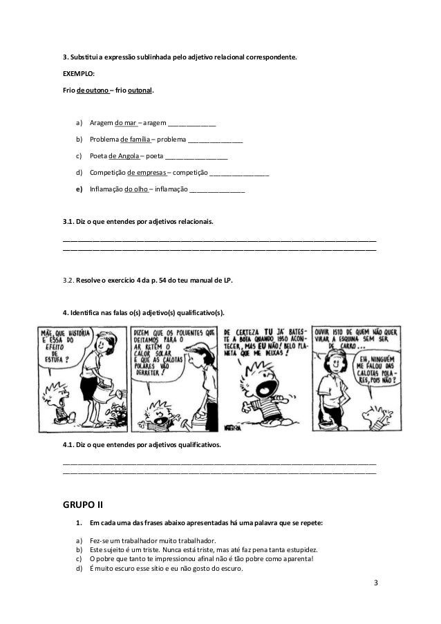 3. 3. 3 3. Substitui a expressão sublinhada pelo adjetivo relacional correspondente. EXEMPLO: Frio de outono – frio outonal. a) Aragem do mar – aragem _____________ b) Problema de família – problema _______________ c) Poeta de Angola – poeta _________________ d) Competição de empresas – competição ________________ e) Inflamação do olho – inflamação _______________ 3.1. Diz o que entendes por adjetivos relacionais. _____________________________________________________________________________________ _____________________________________________________________________________________ 3.2. Resolve o exercício 4 da p. 54 do teu manual de LP. 4. Identifica nas falas o(s) adjetivo(s) qualificativo(s). 4.1. Diz o que entendes por adjetivos qualificativos. _____________________________________________________________________________________ _____________________________________________________________________________________ GRUPO II 1. Em cada uma das frases abaixo apresentadas há uma palavra que se repete: a) Fez-se um trabalhador muito trabalhador. b) Este sujeito é um triste. Nunca está triste, mas até faz pena tanta estupidez. c) O pobre que tanto te impressionou afinal não é tão pobre como aparenta! d) É muito escuro esse sítio e eu não gosto do escuro.