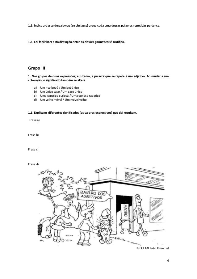 4. 4. 4 1.1. Indica a classe de palavras (e subclasse) a que cada uma dessas palavras repetidas pertence. 1.2. Foi fácil fazer esta distinção entre as classes gramaticais? Justifica. Grupo III 1. Nos grupos de duas expressões, em baixo, a palavra que se repete é um adjetivo. Ao mudar a sua colocação, o significado também se altera. a) Um rico bebé / Um bebé rico b) Um único caso / Um caso único c) Uma rapariga curiosa / Uma curiosa rapariga d) Um velho móvel / Um móvel velho 1.1. Explica os diferentes significados (os valores expressivos) que daí resultam. Frase a) Frase b) Frase c) Frase d) Prof.ª Mª João Pimentel