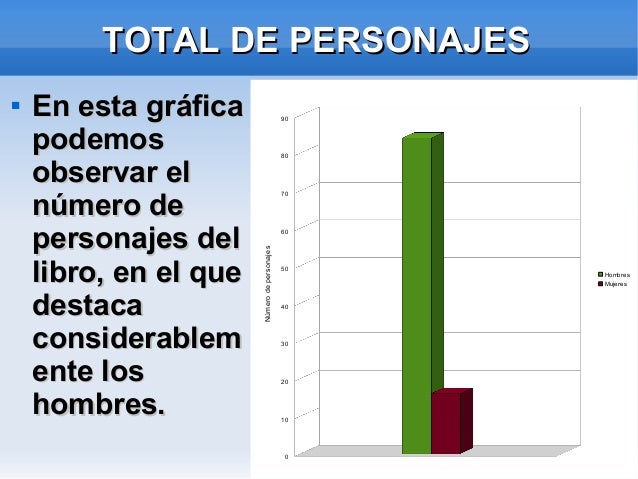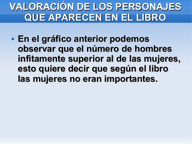 6. 6. VALORACIÓN DE LOS PERSONAJESVALORACIÓN DE LOS PERSONAJESQUE APARECEN EN EL LIBROQUE APARECEN EN EL LIBROEn el gráfico anterior podemosEn el gráfico anterior podemosobservar que el número de hombresobservar que el número de hombresinfitamente superior al de las mujeres,infitamente superior al de las mujeres,esto quiere decir que según el libroesto quiere decir que según el librolas mujeres no eran importantes.las mujeres no eran importantes.