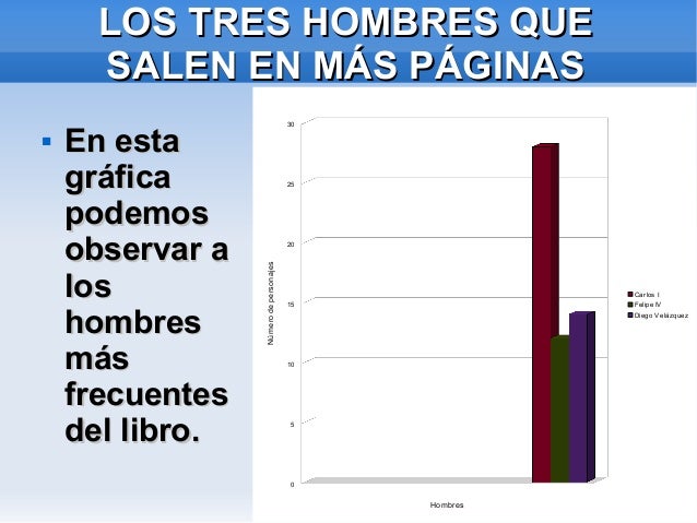 14. 14. LOS TRES HOMBRES QUELOS TRES HOMBRES QUESALEN EN MÁS PÁGINASSALEN EN MÁS PÁGINASEn estaEn estagráficagráficapodemospodemosobservar aobservar alosloshombreshombresmásmásfrecuentesfrecuentesdel libro.del libro.051015202530Carlos IFelipe IVDiego VelázquezHombresNúmerodepersonajes
