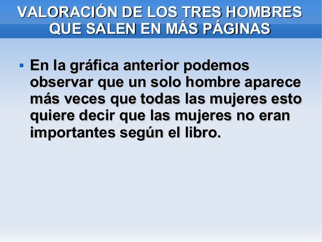 15. 15. VALORACIÓN DE LOS TRES HOMBRESVALORACIÓN DE LOS TRES HOMBRESQUE SALEN EN MÁS PÁGINASQUE SALEN EN MÁS PÁGINASEn la gráfica anterior podemosEn la gráfica anterior podemosobservar que un solo hombre apareceobservar que un solo hombre aparecemás veces que todas las mujeres estomás veces que todas las mujeres estoquiere decir que las mujeres no eranquiere decir que las mujeres no eranimportantes según el libro.importantes según el libro.
