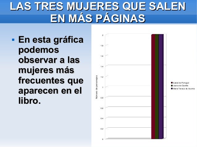 17. 17. LAS TRES MUJERES QUE SALENLAS TRES MUJERES QUE SALENEN MÁS PÁGINASEN MÁS PÁGINASEn esta gráficaEn esta gráficapodemospodemosobservar a lasobservar a lasmujeres másmujeres másfrecuentes quefrecuentes queaparecen en elaparecen en ellibro.libro.00.20.40.60.811.21.41.61.82Isabel de PortugalJuana de CastillaMaría Teresa de AustriaNúmerodepersonajes
