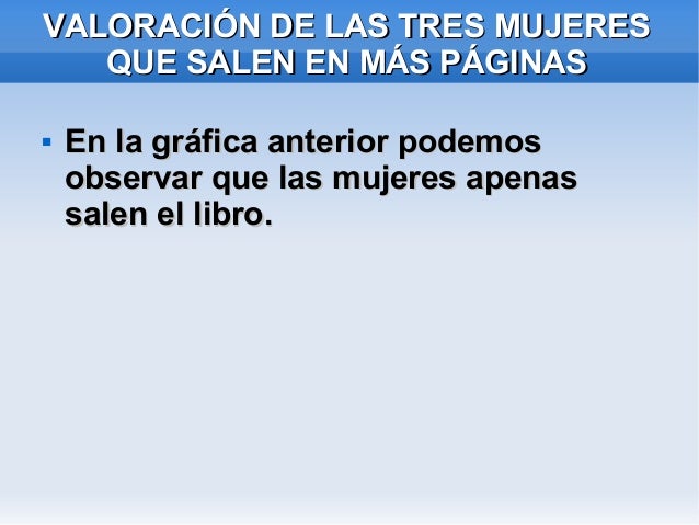 18. 18. VALORACIÓN DE LAS TRES MUJERESVALORACIÓN DE LAS TRES MUJERESQUE SALEN EN MÁS PÁGINASQUE SALEN EN MÁS PÁGINASEn la gráfica anterior podemosEn la gráfica anterior podemosobservar que las mujeres apenasobservar que las mujeres apenassalen el libro.salen el libro.