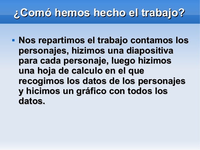2. 2. ¿Comó hemos hecho el trabajo?¿Comó hemos hecho el trabajo?Nos repartimos el trabajo contamos losNos repartimos el trabajo contamos lospersonajes, hizimos una diapositivapersonajes, hizimos una diapositivapara cada personaje, luego hizimospara cada personaje, luego hizimosuna hoja de calculo en el queuna hoja de calculo en el querecogimos los datos de los personajesrecogimos los datos de los personajesy hicimos un gráfico con todos losy hicimos un gráfico con todos losdatos.datos.