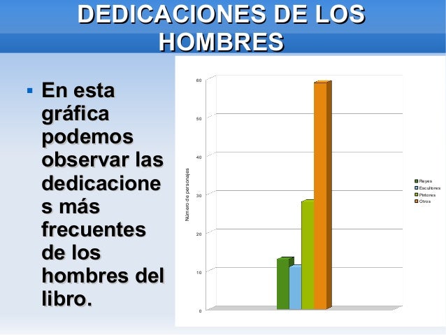 20. 20. DEDICACIONES DE LOSDEDICACIONES DE LOSHOMBRESHOMBRESEn estaEn estagráficagráficapodemospodemosobservar lasobservar lasdedicacionededicaciones máss másfrecuentesfrecuentesde losde loshombres delhombres dellibro.libro. 0102030405060ReyesEscultoresPintoresOtrosNúmerodepersonajes