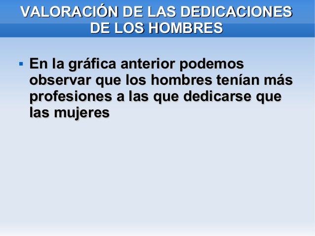 21. 21. VALORACIÓN DE LAS DEDICACIONESVALORACIÓN DE LAS DEDICACIONESDE LOS HOMBRESDE LOS HOMBRESEn la gráfica anterior podemosEn la gráfica anterior podemosobservar que los hombres tenían másobservar que los hombres tenían másprofesiones a las que dedicarse queprofesiones a las que dedicarse quelas mujereslas mujeres