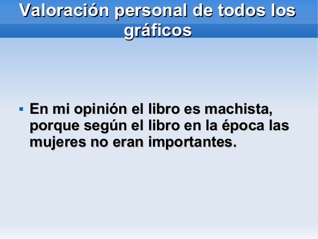 22. 22. Valoración personal de todos losValoración personal de todos losgráficosgráficosEn mi opinión el libro es machista,En mi opinión el libro es machista,porque según el libro en la época lasporque según el libro en la época lasmujeres no eran importantes.mujeres no eran importantes.