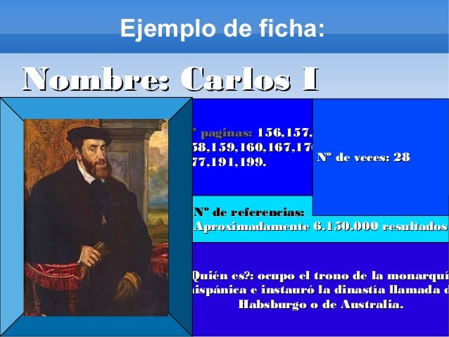 3. 3. Ejemplo de ficha:Nombre: Carlos INombre: Carlos I¿Quién es?: ocupo el trono de la monarquí¿Quién es?: ocupo el trono de la monarquíhispánica e instauró la dinastía llamada dhispánica e instauró la dinastía llamada dHabsburgo o de Australia.Habsburgo o de Australia.Nº de referencias:Nº de referencias:Aproximadamente 6.150.000 resultadosAproximadamente 6.150.000 resultadosNº paginas:Nº paginas: 156,157,156,157,158,159,160,167,176,158,159,160,167,176,177,191,199.177,191,199. Nº de veces: 28Nº de veces: 28
